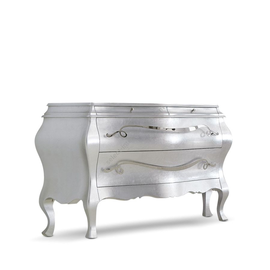 Neoclassic chest of 2 drawers with small secretaire with shaped sides. With the bedside tables of same collection Maya is an original proposal for the bedroom, with strong personality. This unusual curvaceous chest of drawers will create a dramatic presence in any bedroom. Available in a large range of finishings to make bespoked creations.