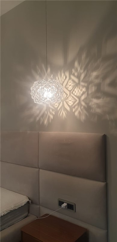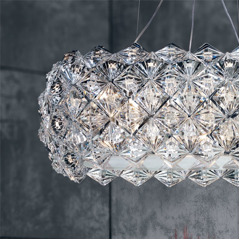 Acrylic multi-faceted prisms, of very high quality and extremely pure transparency, anti-yellowing notwithstanding time, form an oval lampshade.