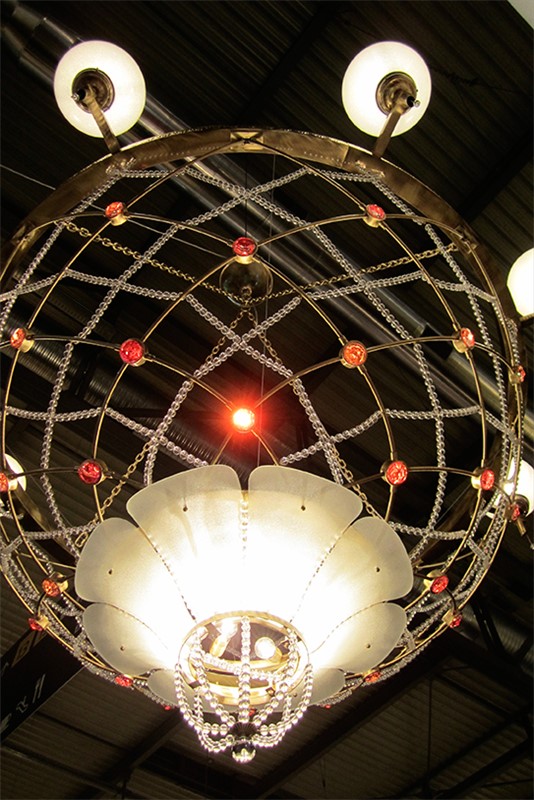 Wide milk white blown glass spheres, clear glass pearls and big multi-faceted crystals in front of the rgb led lights.