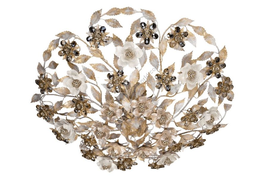 7 lights ceiling lamp in wrought iron with coloured Bohemian crystal and ceramic biscuit