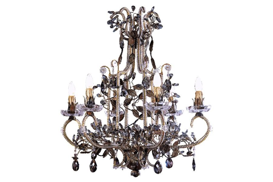 chandelier in wrought iron with clear and coloured Bohemian crystal and clear pearl banding