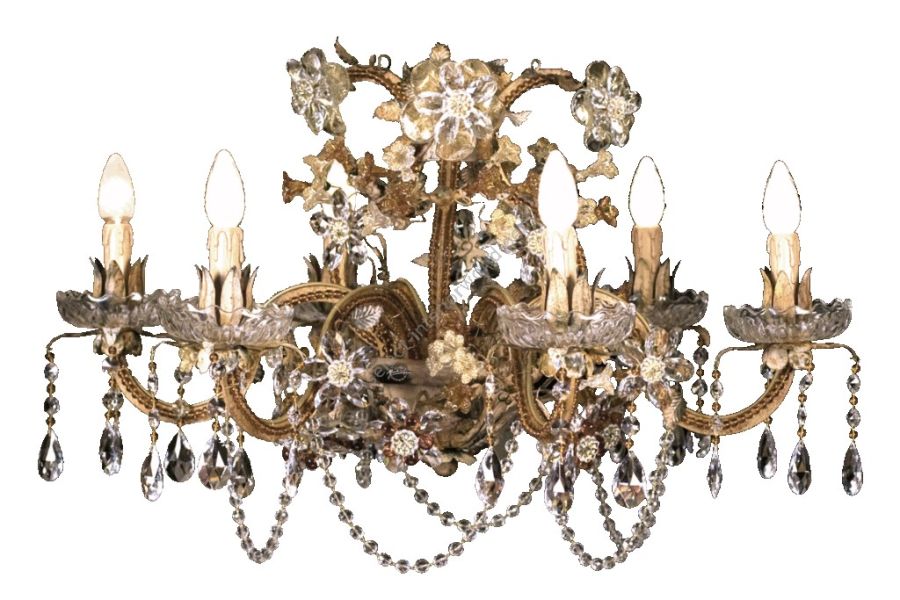 chandelier in wrought iron with clear Bohemian crystal, Murano glass and colored pearl banding
