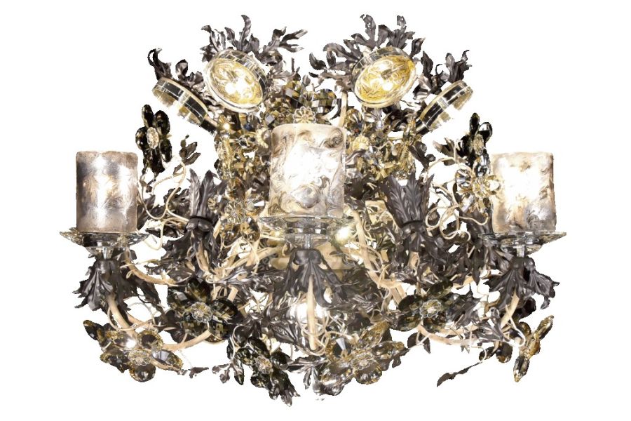 chandelier in wrought iron with clear and coloured Bohemian crystal