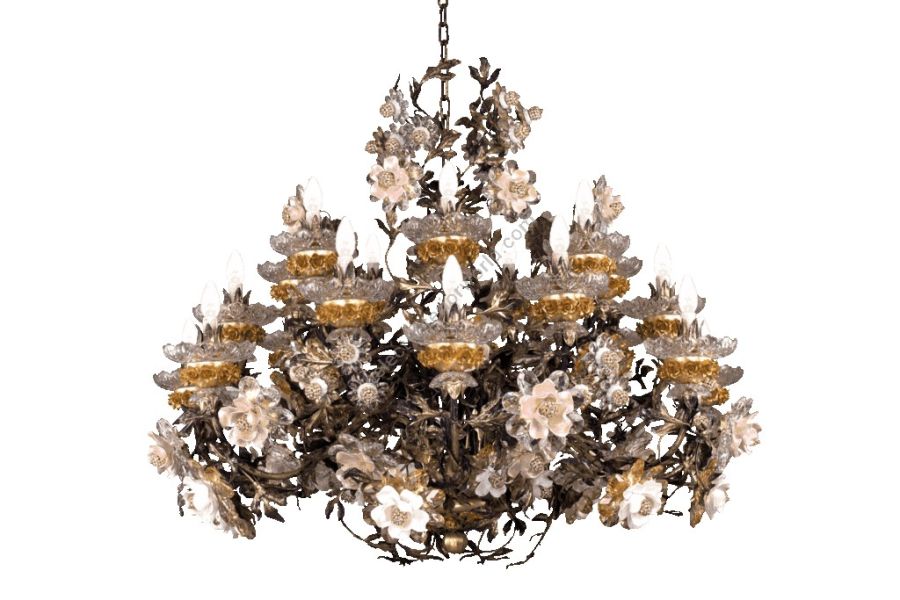 21 lights + 7 lights chandelier in wrought iron with clear Bohemian crystal and biscuit ceramic