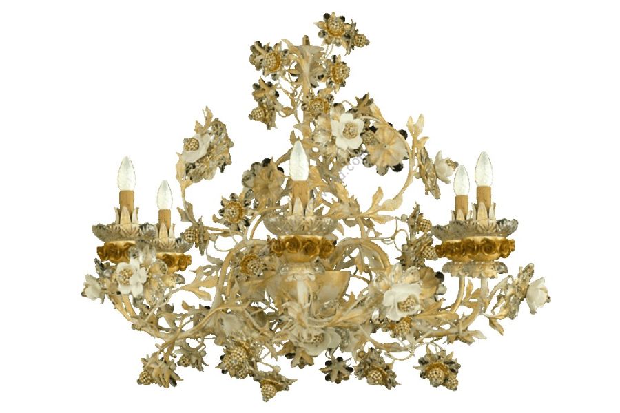 chandelier in wrought iron with clear Bohemian crystal and biscuit ceramic