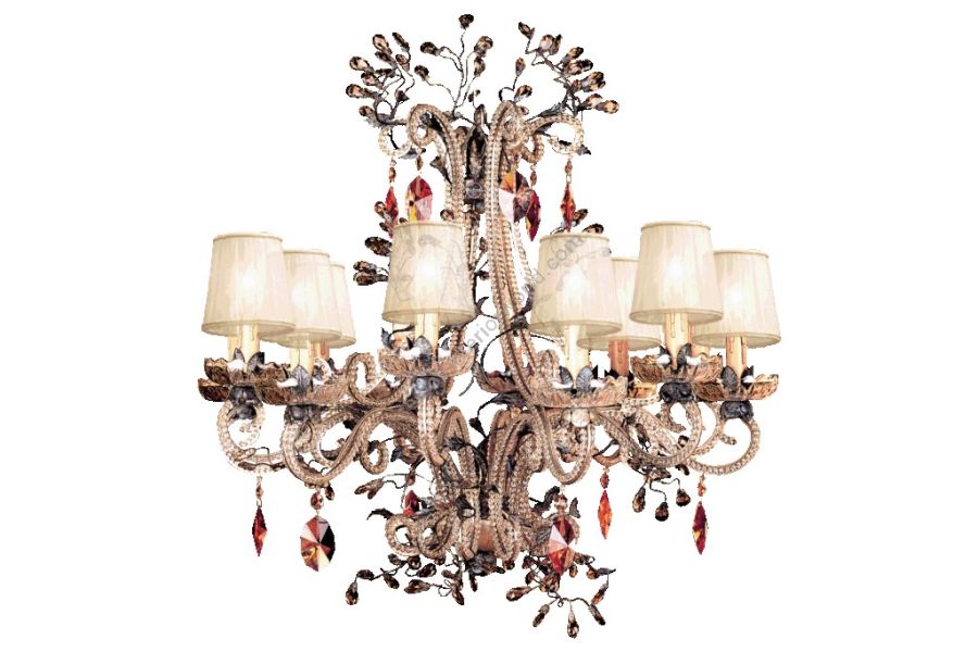 chandelier in wrought iron with coloured Bohemian crystal and clear pearl banding and silk lampshade
