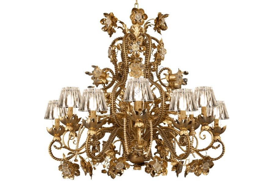 12 lights chandelier in wrought iron with clear and coloured Bohemian crystal, Murano glass, crystal pearl banding, porcelain and crystal lamp shade