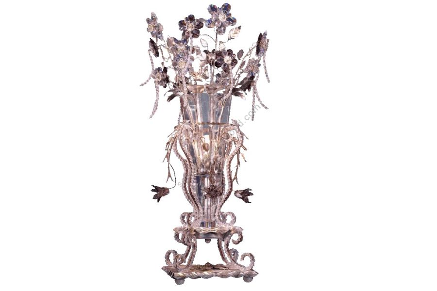 1 light + 4 leds table lamp in wrought iron with crystal vase, clear and colored Bohemian crystal, Murano glass and iridescent pearl banding