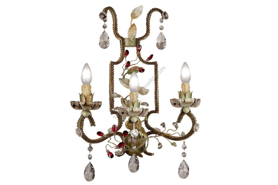 3 lights wall lamp in wrought iron with clear and colored Bohemian crystal