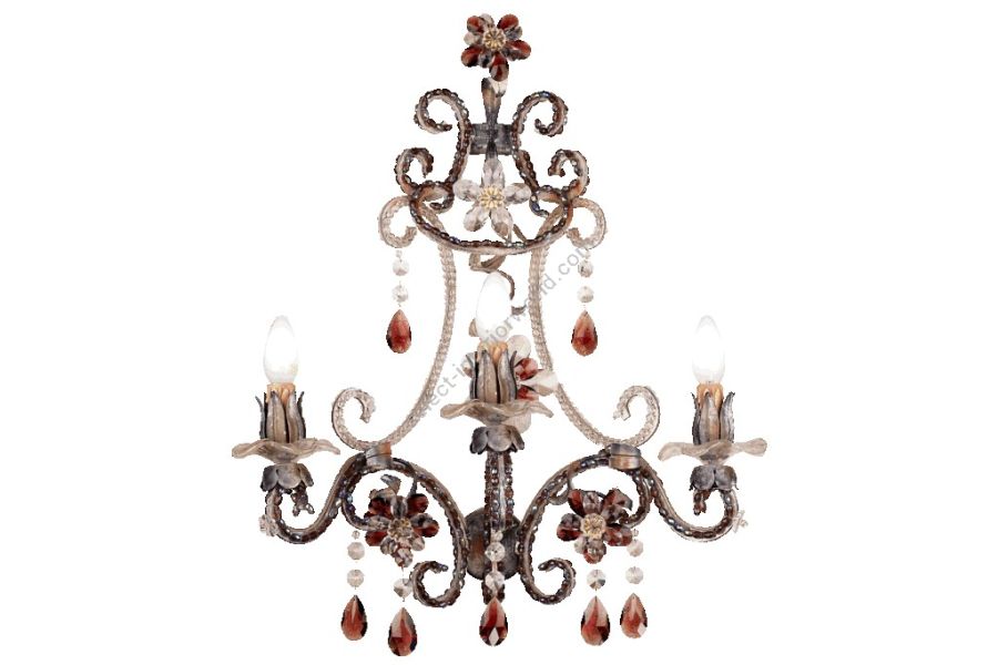 2 lights wall lamp in wrought iron with clear and coloured Bohemian crystal, Murano glass and colored pearl banding