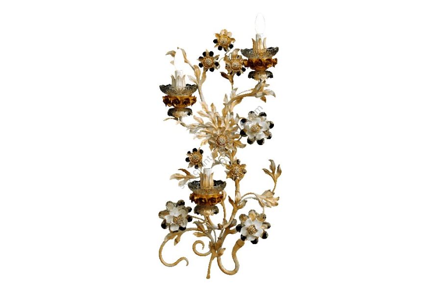 3 lights wall lamp in wrought iron with clear Bohemian crystal and biscuit ceramic