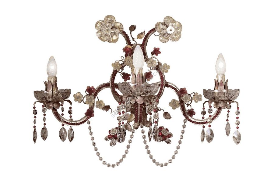 3 lights wall lamp in wrought iron with clear and colored Bohemian crystal and Murano glass