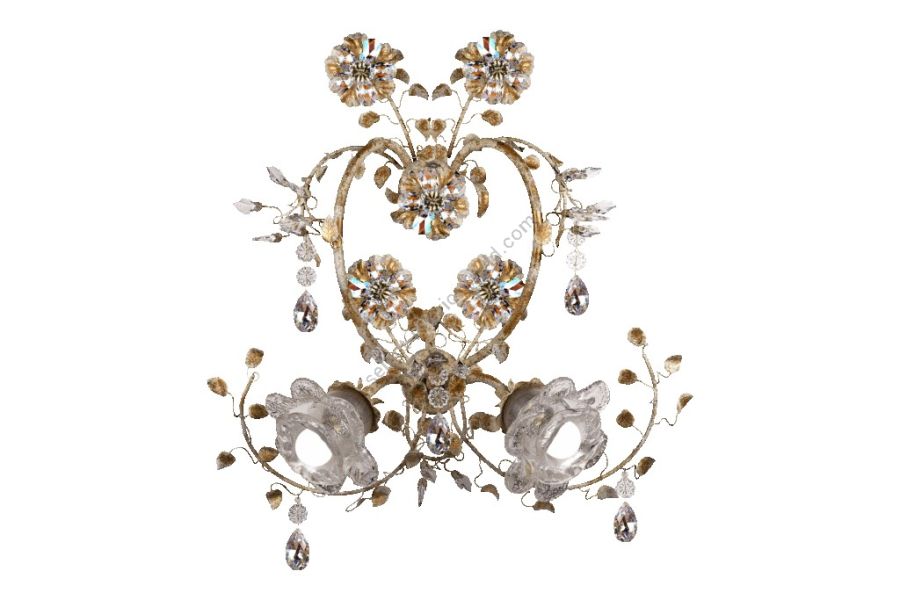 2 lights wall lamp in wrought iron with clear and colored Bohemian crystal and Murano glass