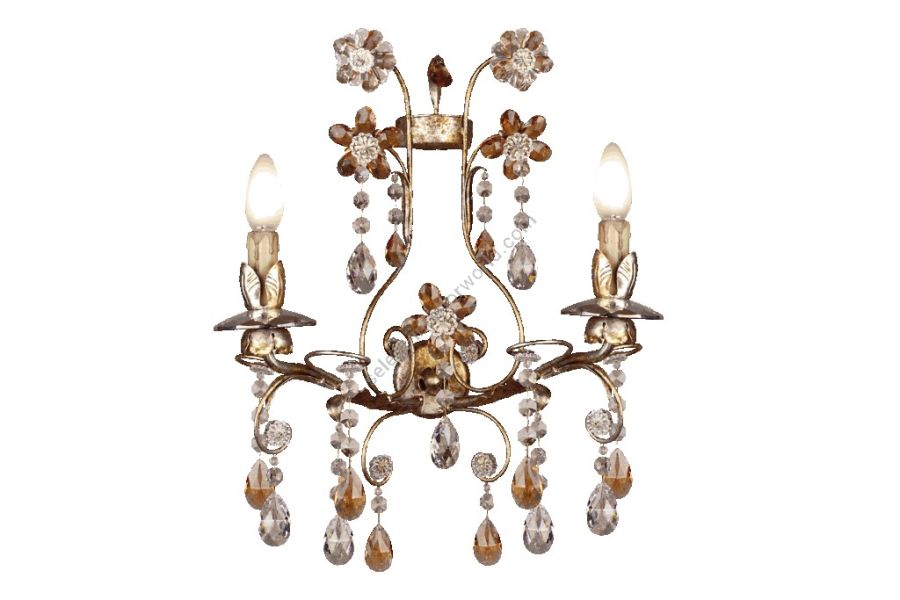 2 lights wall lamp in wrought iron with clear and colored Bohemian crystal