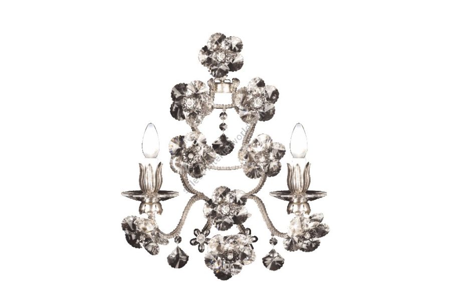 2 lights wall lamp in wrought iron with clear and colored Bohemian crystal, porcelain, clear Bohemian pearl banding