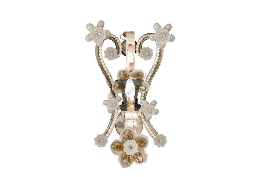 1 light wall lamp in wrought iron with amber venetian crystal, Bohemian pearl banding, white porcelain flowers