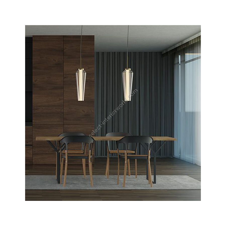The precise geometry has profound references to ancient architecture, and exemplifies the sense of imposing proportion with a solid glass diffuser, whose vertical striations confer verticality, order and rigor. A second internal diffuser helps to diffuse the light, acting as an optical guide, transporting the light throughout the entire volume.
