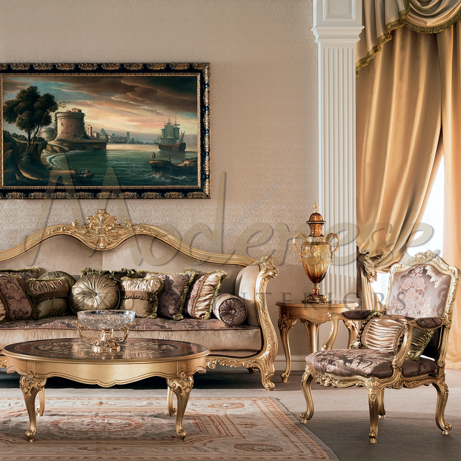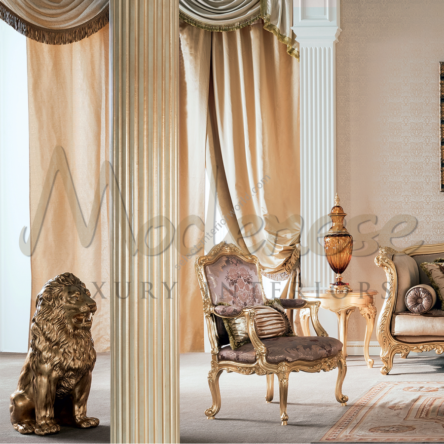 A beige classic armchair with armrests from Modenese Furniture is a type of chair that features a traditional design with a comfortable seat, backrest, and armrests. It is typically upholstered in a beige-colored fabric, giving it a neutral and versatile appearance that can blend well with various decor styles.