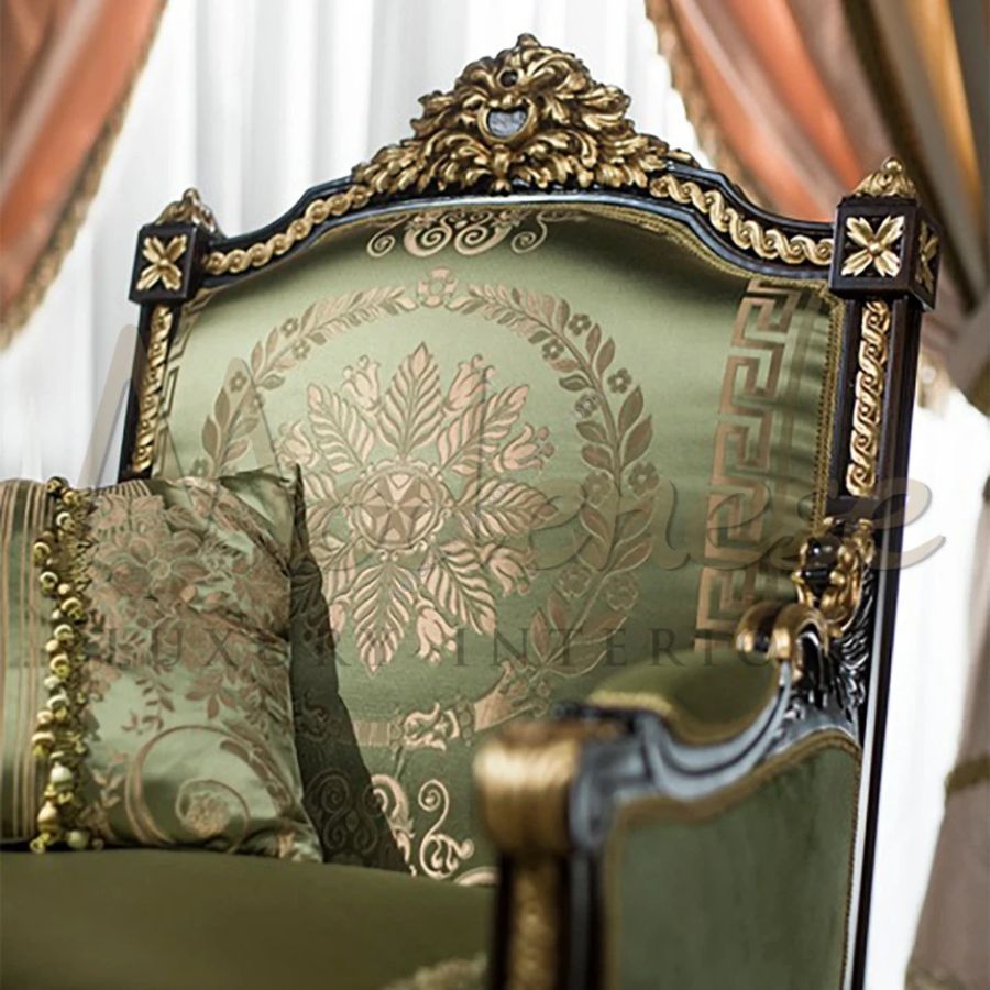 A classic luxury armchair in timeless emerald green upholstery. Neatly crafted with the finest quality fabric on the dark solid wood frame, finishing with the exquisite golden decorative in an exceptional Modenese design. A great accent piece to elevate the ordinary living into an elegant luxurious space. The armchair is a unique piece on its own but in a set, it will bring a much glamorous atmosphere.