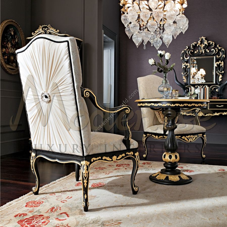 A glimpse to the past, with handcrafted luxury pieces of timeless rococo beauty. An elegant upholstered seating gracefully on top of the contrast black painted carving wooden frame. Beautiful golden decorative details carefully added as intricate accessories to the black frame. This piece of furniture easily brings an elegant touch to your luxury decor scheme. Fabric choice and wooden frame colours can be customised in different options upon request.