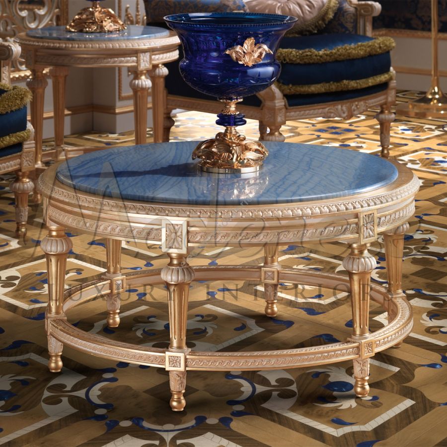 Modenese artisans’ knowledge of gold leaf applications goes beyond imagination. The true essence of their work is shown through this magnificent round coffee table that catches the eye with its tasteful combination of Azul Macaubas marble and shining gold leaf applications. its round structure and six empire-style legs give it the elegance required to shine in the world's best palaces.