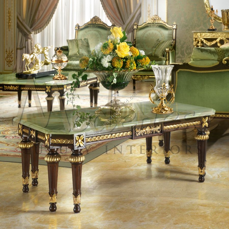 A decorative complementary item that will make the difference, this rectangle square coffee table is not for everyone. Green beveled onyx top, eight empire-style legs and walnut finish with gold leaf applications all over the carvings. So many secret details you can spend a night counting them. Modenese Furniture can also offer paired armchairs, sofas and tables.