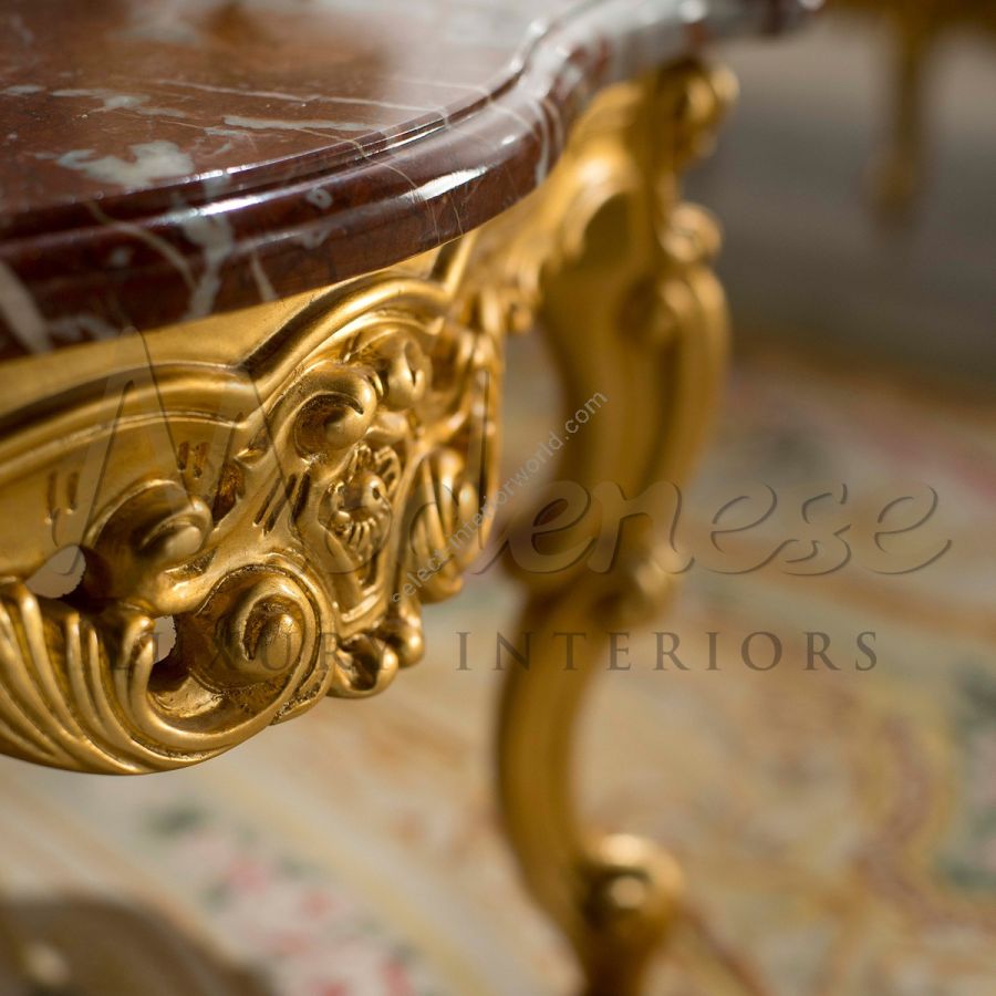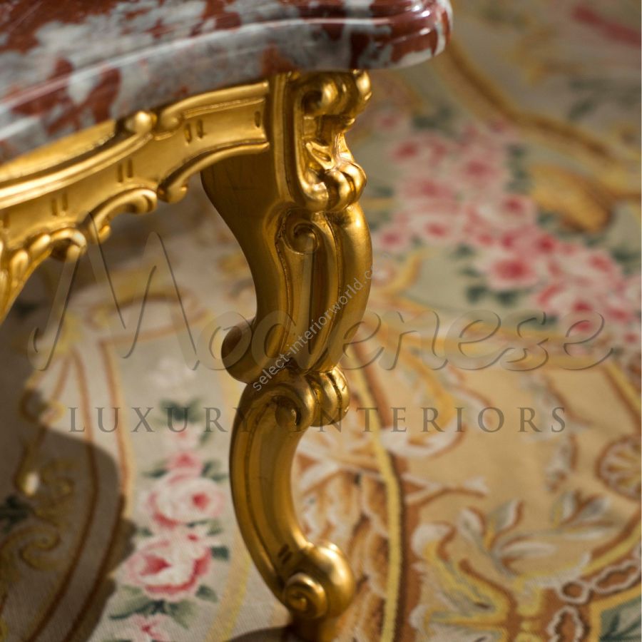 Neo-Baroque figured coffee table with exquisite Rosso Francia marble top and gold leaf finished structure. This piece sophisticatedly represents Modenese skills in blending wood and marble. Our product stands a real Italian luxury décor for residential villas and living rooms.