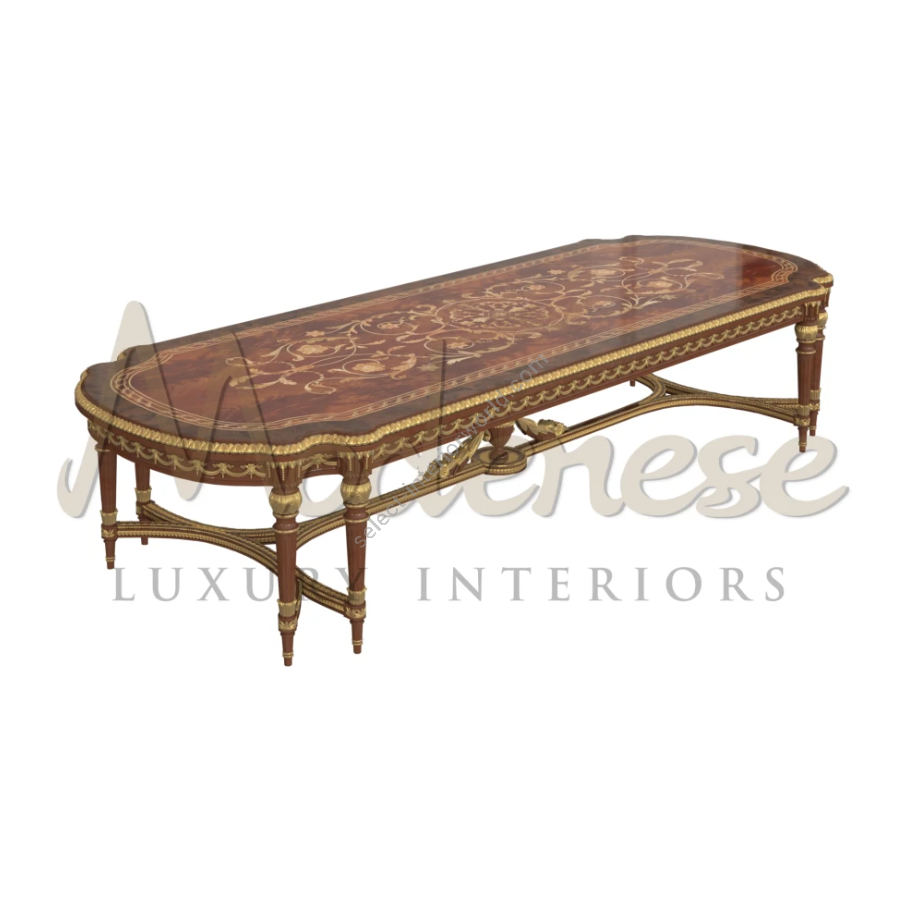 A classic large table, with intricate inlay design top can accommodate a warm gathering up to 10 seatings. Ornate with golden motif details all around the table to enhance the excellency and grandeur presence. The subtle delicacy and nobility exemplified through this table can be easily placed in the room to make the statement.
