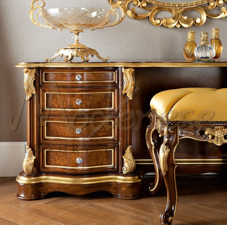 Made of solid wood with crafted details and a walnut finishing, this Modenese Furniture vanity unit adds an elegant and timeless feel to your room. Precious veneer on the drawers and side panels, furnished with blumotion soft-closing system, added to hand appliqué gold leaf and crystal handles, combining technology and luxury aesthetics. The timelessness of this unity goes perfectly with mirrors, chairs and armchairs, but also night tables and credenzas.