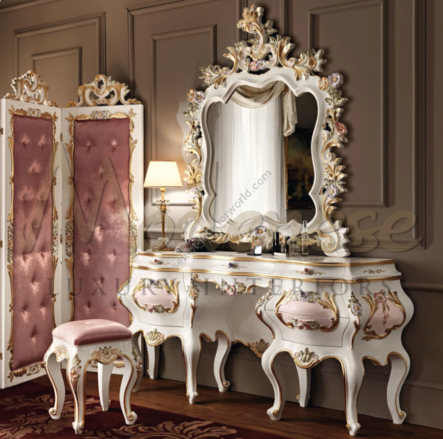 | Finish: | White lacquered finishing, Rosa Veneziano, gold leaf details, Rose-Shaped Knobs |