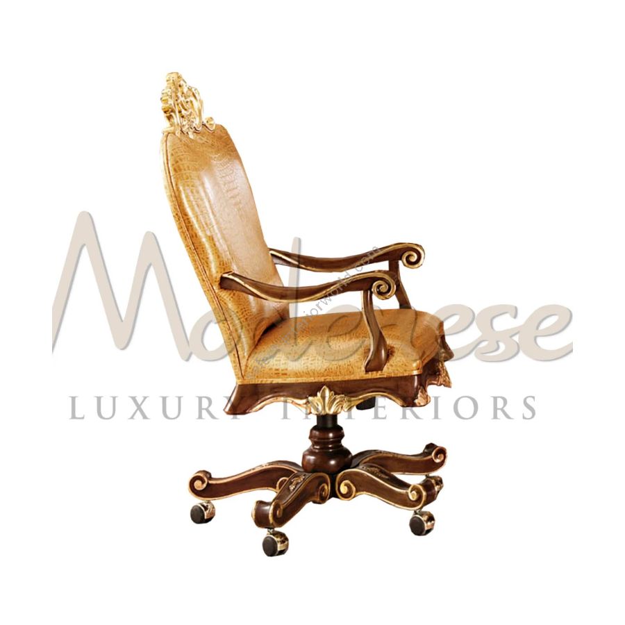 This Modenese Furniture swivel armchair has been designed and produced for top managers and company owners. its unique authority and quality materials represents the perfect solution for leading figures. The armchair structure is made of top-level solid wood finish in patinated walnut and decorated in gold leaf.