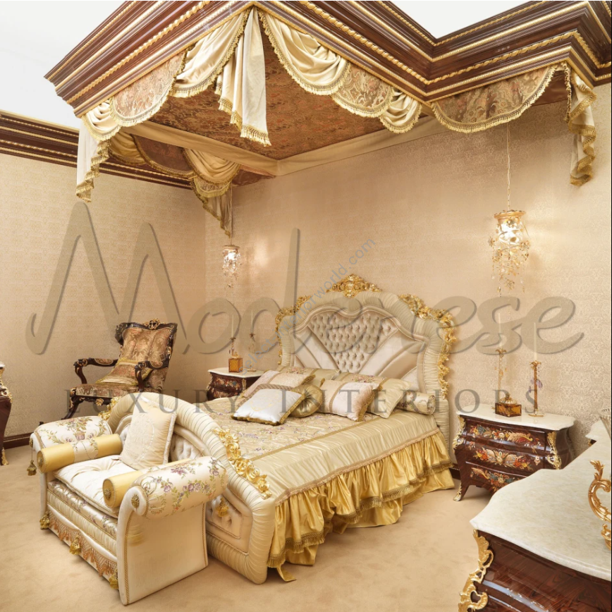 The ornamental quality of this hand painted baroque night stand is truly astonishing. The high-end wood finishing, the baroque carvings completely decorated with gold leaf and 3D inlays, curved lines are such a match with baroque bedrooms including beds, cabinets and wardrobes.