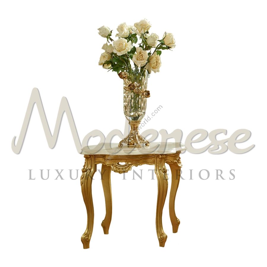 Slim and figured square side table with morbid edges and delicate carvings on the legs, decorated on the lower structure with pure gold-leaf . Goes well into luxury livings in private villas or summer penthouses. Modenese Luxury Interior design.