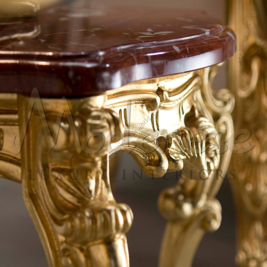 Neo-Baroque figured side table with Rosso Francia marble top and gold leaf finished structure. This piece represents exquisitely well Modenese skills in blending wood and marble. Our product stands a real Italian luxury décor for residential villas and living rooms.