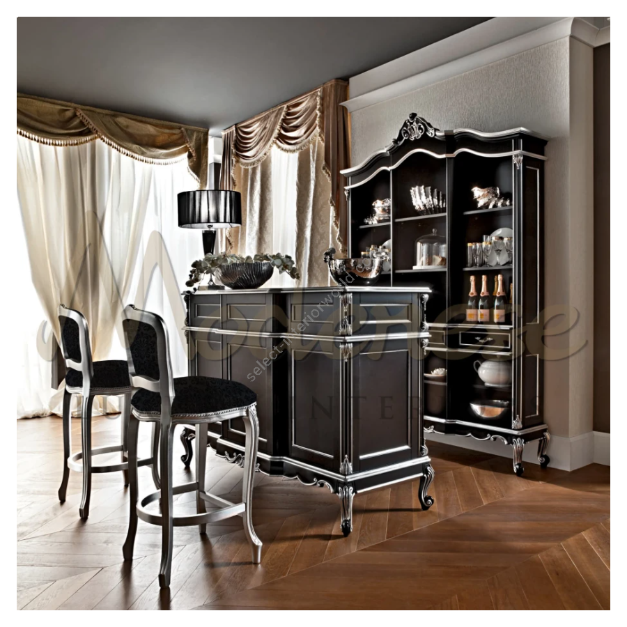 This elegant bar stool features a solid carved wood frame, premium black fabric upholstered seats, cabriole legs and a wooden round footrest in silver leaf finish. Fits perfectly in classic houses but also in informal settings, usually paired with a bar counter.