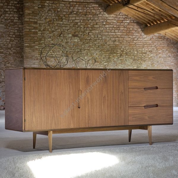 Walnut sideboard with 2 doors, 1 adjustable shelf and 3 drawers with metal runners. Particular diagonally inlaid handles. Base frame with wooden legs with a triangular section. The Californian furniture of the sixties and seventies inspired the Malibu’ collection. The collection was designed by the internal MAAM Research Center, engaged in the constant research and development of unique high quality products. Malibù is a vast collection for the living room area, with sideboards tables and chairs but also for the bedroom with beds, and complementary elements able to give originality and freshness to any corner of the house.