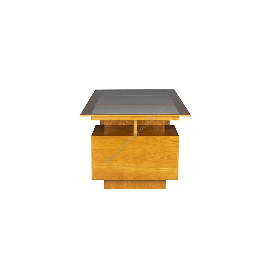 Double sided writing desk with two base parts containing larg modules with door and drawers. Top with precious leather insert.