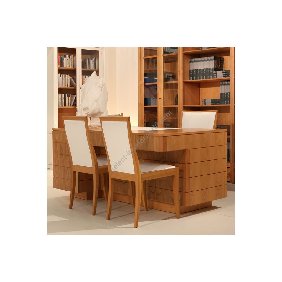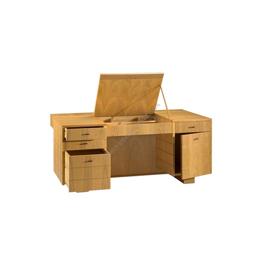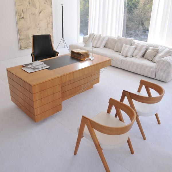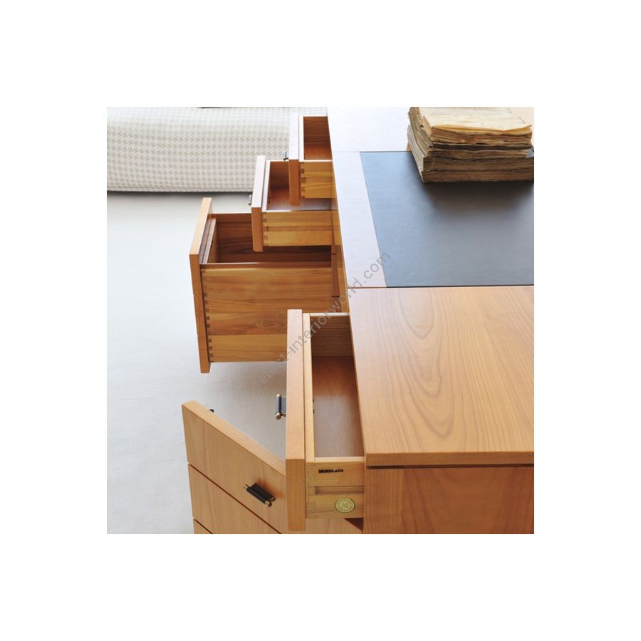Developed by the MAAM Research Center, the Roma desk project was born from the study of the works of Guglielmo Ulrich. A rigorous, plastic design for this professional desk with important dimensions. Made of cherry wood with a writing surface, covered in leather, and storage compartments, Roma is a highly decorative desk that encompasses in the refined surface workmanship and construction details, craftsmanship and high quality typical of Italian cabinetmaking.