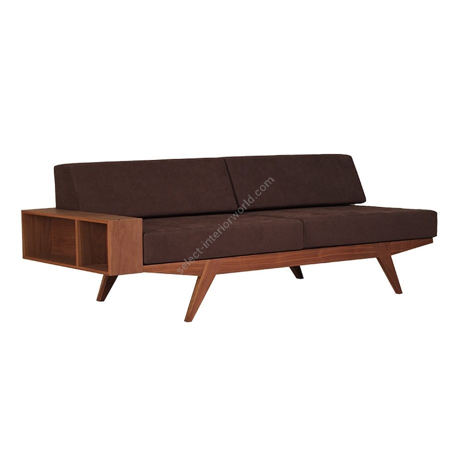 Sofa bed with cherry wood frame and armrest with storage compartment. Cushions upholstered with leather or fabric. Upon request made of walnut wood.
