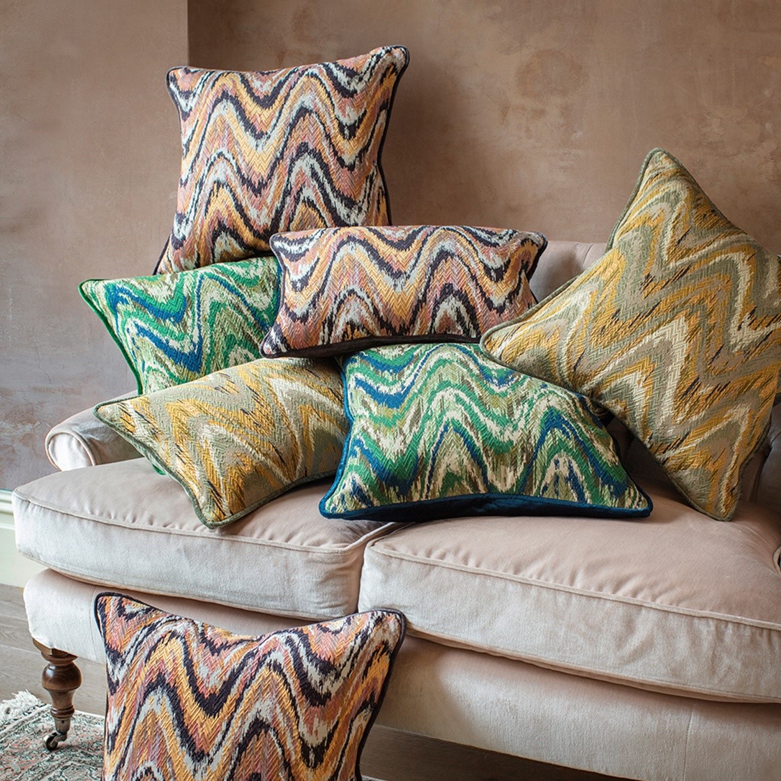Cool tones of green work beautifully with warm golden hues to create this sophisticated flame stitch cushion, backed and piped in Como silk velvet in Moss. Available for immediate delivery.