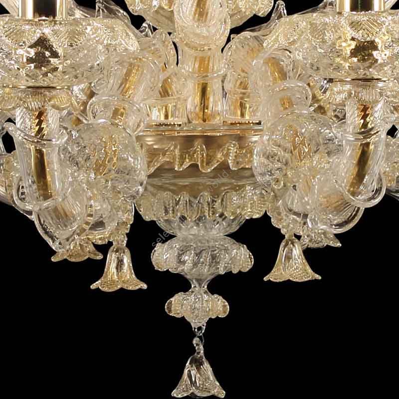 A traditional Ca’ Rezzonico chandelier, re-elaborated in accordance with the tradition and available in a wide variety of models. The arms of the Ca’ Rezzonico chandelier are made of single glass elements called “bossole”, wich are inserted one by one on the metal structure, which is called “gabbia” (cage).
