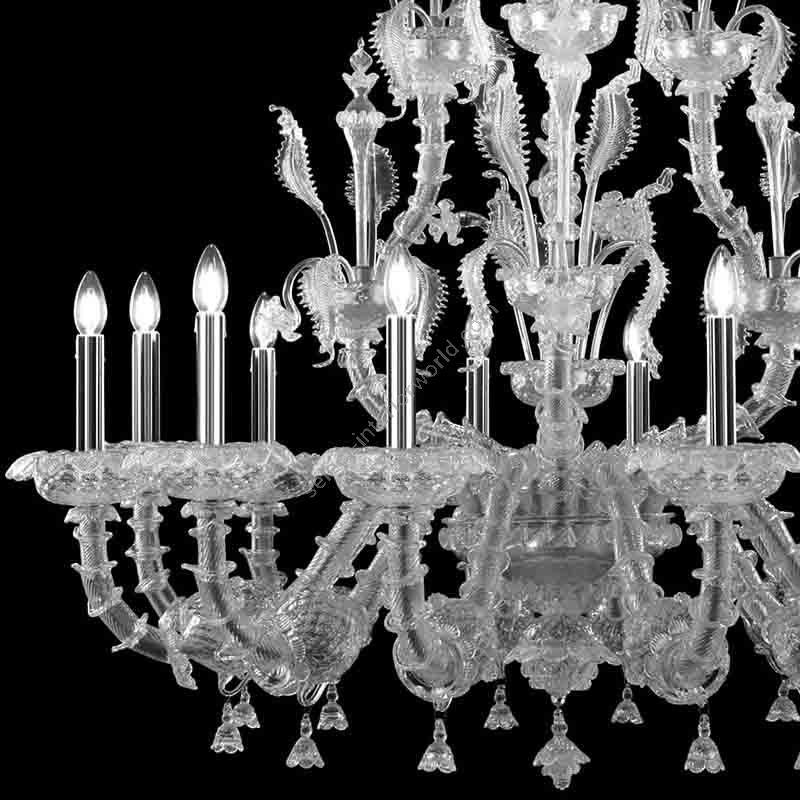 This is the basic structure of the Ca’ Rezzonico Murano chandeliers, then a multitude of decorative elements is added to the structure to enrich it. This decorations are harmoniously distributed on the surfaces, without weighing down the structure.