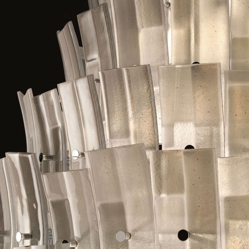 The modern style glass chandelier Chimera is our tribute to the design of the 60’s and its typical creative patterns. This lighting work is composed of modular elements: glass listels in the tones of grey, handcrafted using a combination of different techniques, are fixed on the structure with chromed screws.