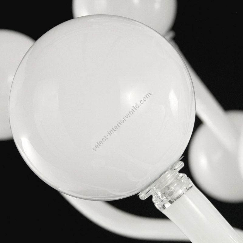 The central column has been transformed in a wavy element. From the two bottom bowls depart two tiers of arms of different forms and lengths, which are placed around the central column in an irregular way. At the end of every arm, the light source has been enclosed in a sphere of hand-blown glass, so it is completely hidden inside the glass structure.