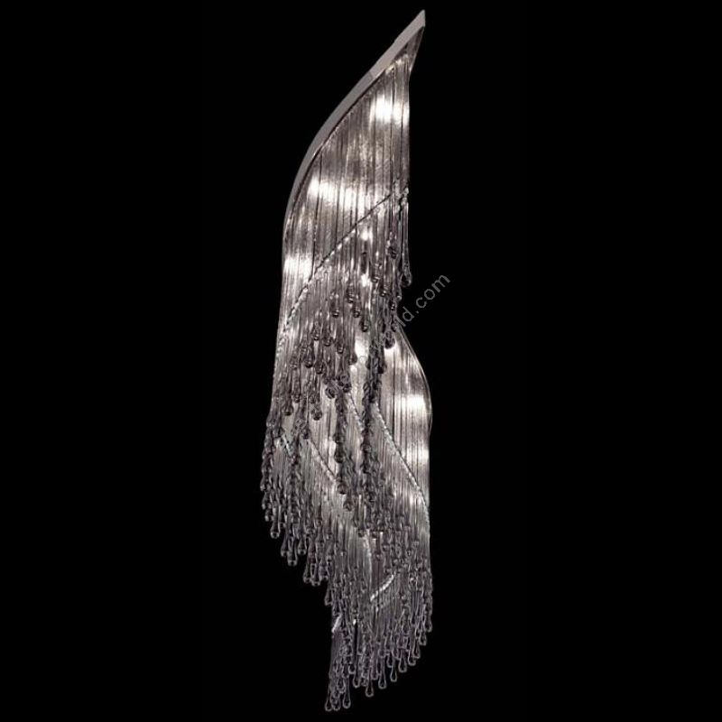 The whole structure of this chandelier is composed of a cascade of tiny glass elements of different shapes, that reminds the fringes typical of the 20’s fashion: thin glass foils, drop-shaped elements and Swarovski glass elements.