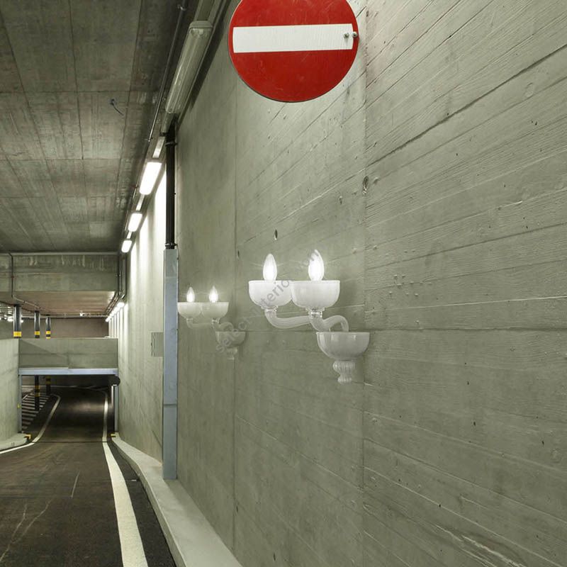 All the elements that form this wall lamp are worked using the "rigadin" technique, that allows to obtain a dynamic surface and many reflections on the glass. The clear arms extend through the external space; the unusual and refined final element encloses the whole structure.