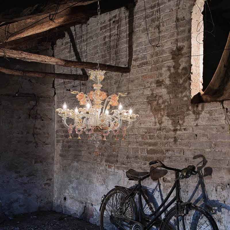 The blown glass chandelier Fenix, with its floral style, harks back to the venetian classic tradition. The decorative elements are characterized by flowers modelled petal by petal, and embellished with “morelline” (a typical venetian decorations).