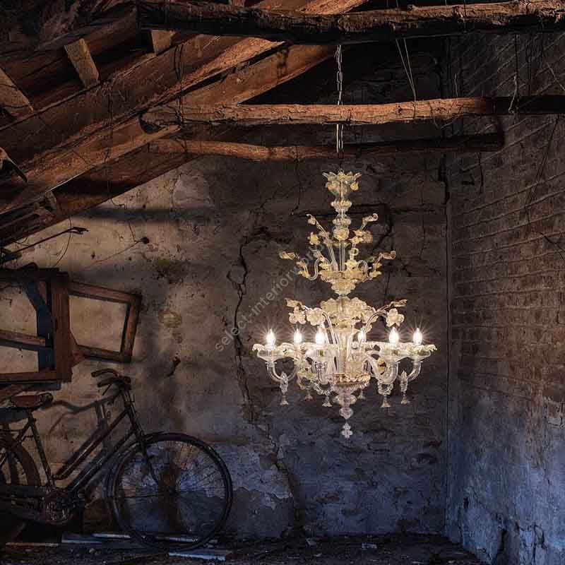 The blown glass chandelier Fenix, with its floral style, harks back to the venetian classic tradition. The decorative elements are characterized by flowers modelled petal by petal, and embellished with “morelline” (a typical venetian decorations).