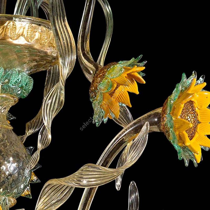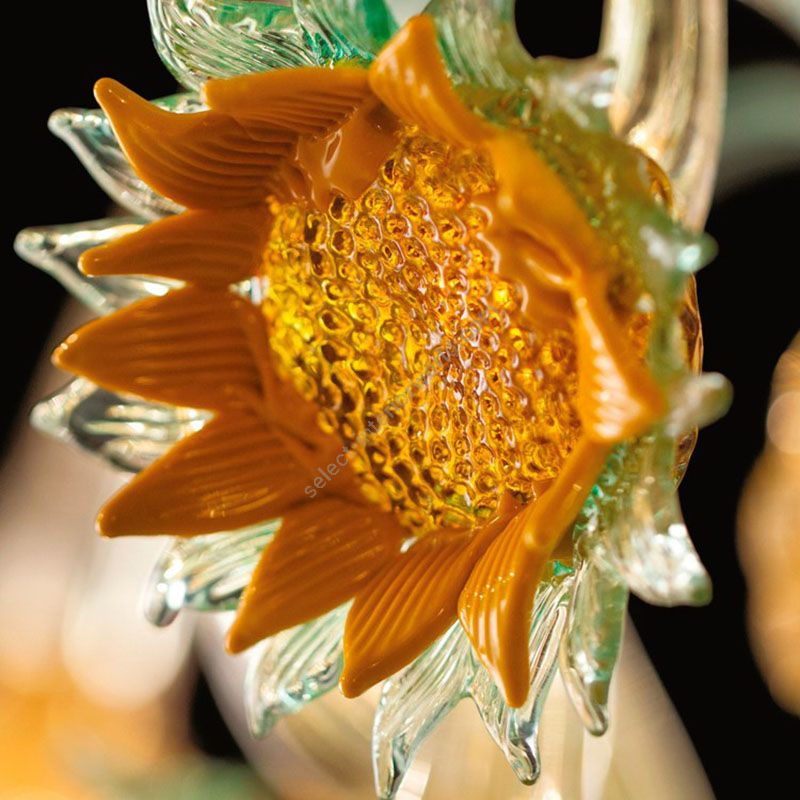 From the heart of the chandelier a number of stems spread out, at the end of them a glass sunflower has been attached. Tiny decorations that resemble some vegetal elements complete the chandelier and confer a certain dynamicism to the whole structure. The colours exalt the uniqueness of this chandelier: the golden tone of the structure is combined with the warm tones of the flowers, the whole structure is embellished with green and amber details.