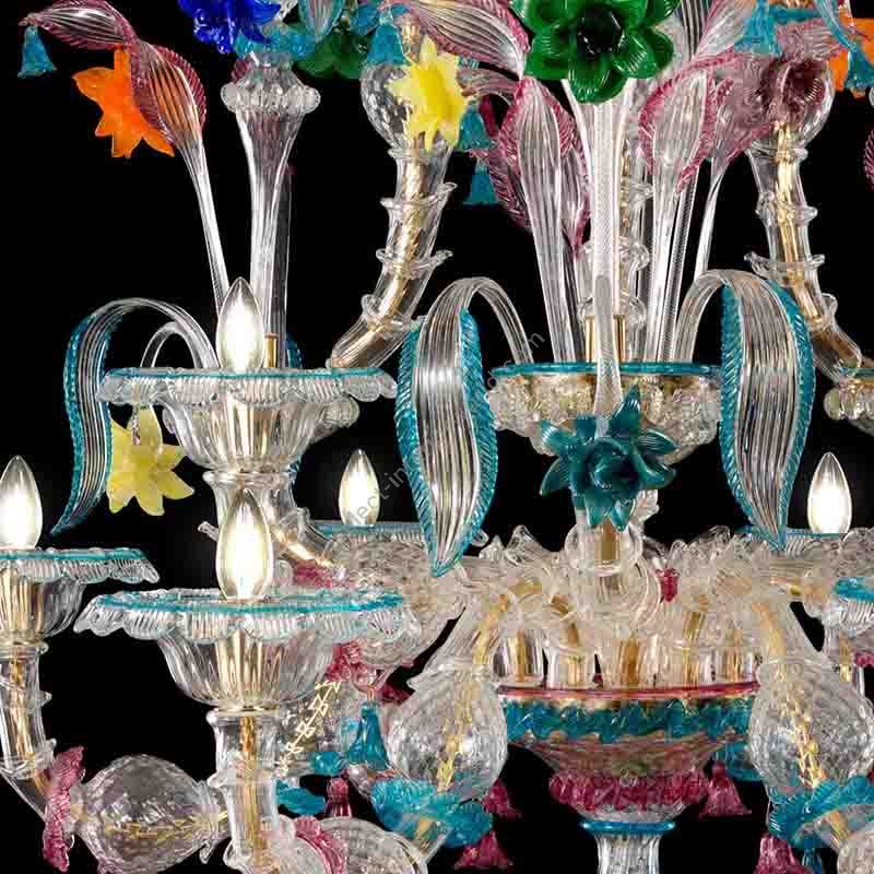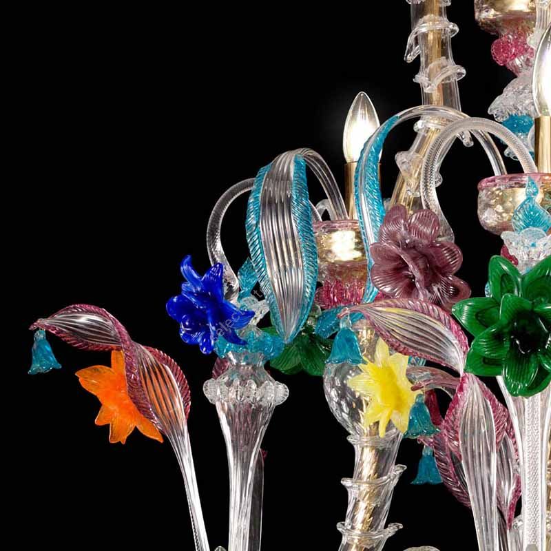 This is a Ca’ Rezzonico chandelier, to which a multitude of colourful details have been attached: “morrise”, the cups’ edge, leaves and flowers are coloured in green, yellow, orange and pink.